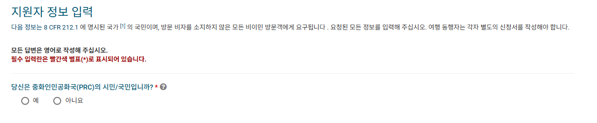 👉 면책 조항 - 지원자 정보 - 개인정보 - 여행정보 - 자격질문 - 검토 신청서 - 제출 순으로 이루어 집니다.