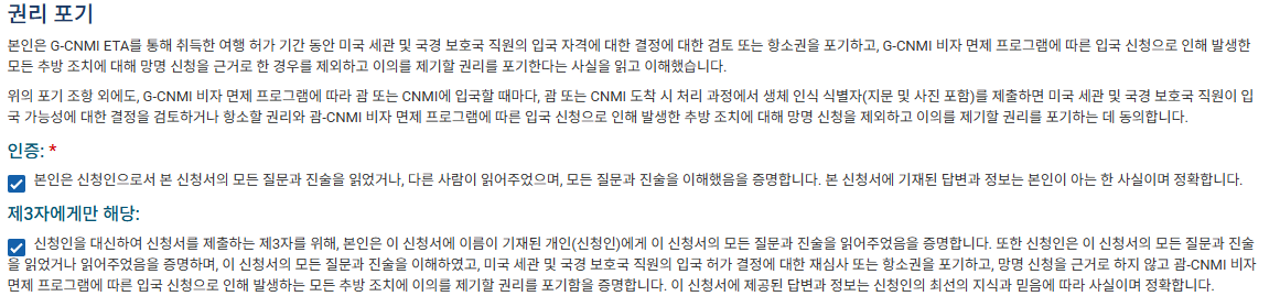 ETA신청서는 개별로 각자 신청 하셔야 합니다. 본인이 직접 신청하면 위에 칸만 체크, 저처럼 남편, 아이 모두 제가 신청했던 터라 저는 남편과 아이것 신청할 때는 제 3자에게만 해당 내용에도 체크를 해주었습니다!