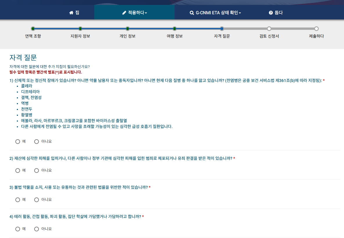 자격질문은 건강 상태, 범죄 기록, 입국 목적 확인 질문 등이 나옵니다.
