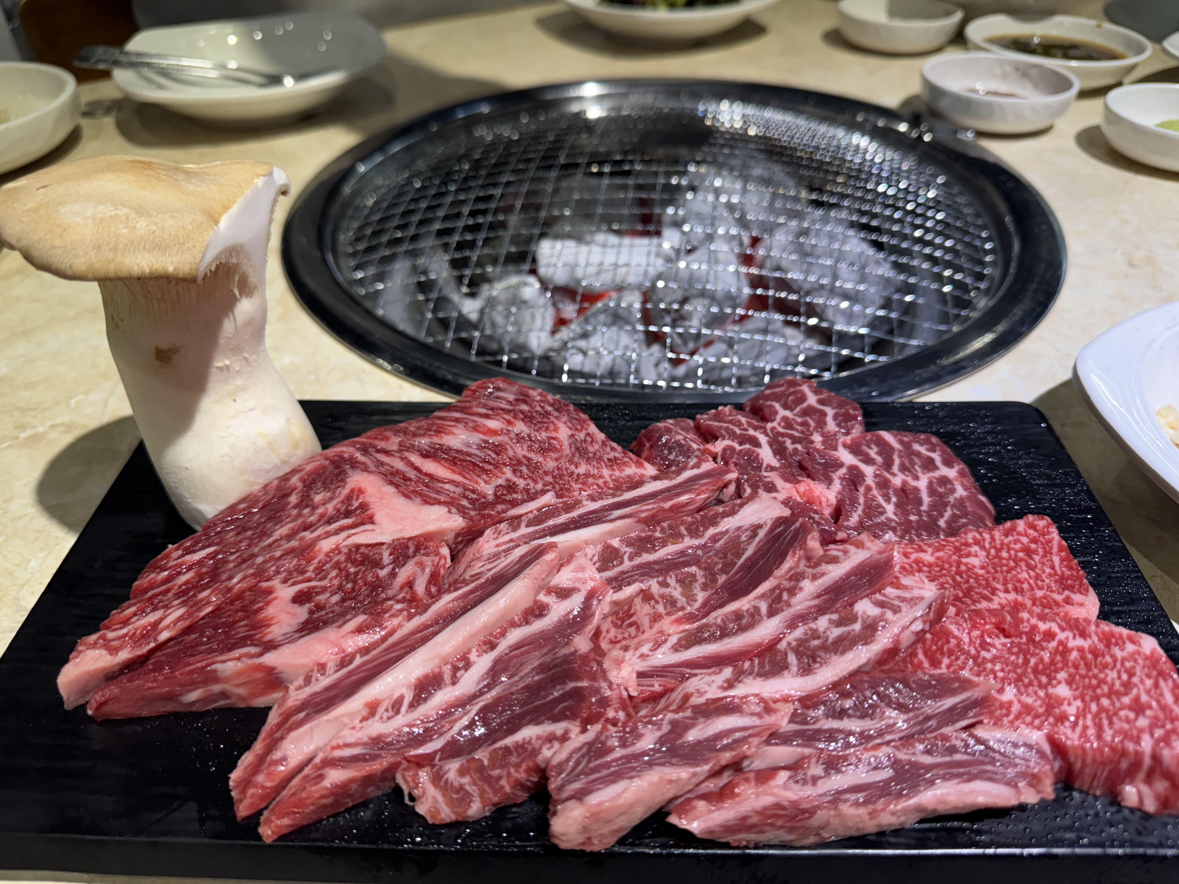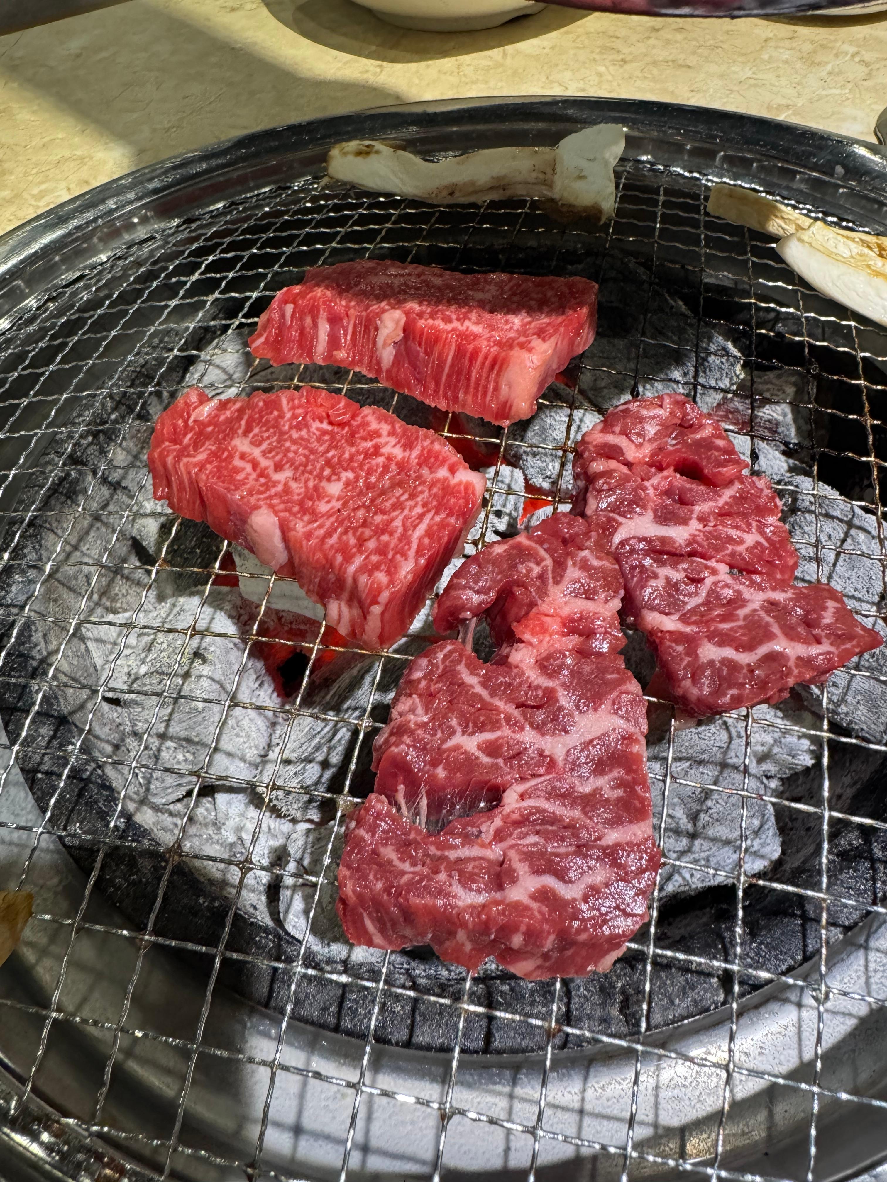 이번에 가장 기대했던 건 바로 와규 커플 메뉴였어요. 고기가 나오자마자 선홍빛 육질부터 시선을 사로잡았는데, 직접 숯불에 구워 한 점 먹어보니… “아, 이게 바로 진짜 고기구나” 싶었습니다.